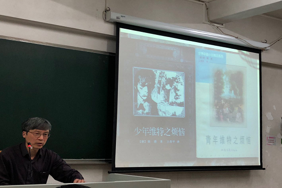 卫茂平教授就自己的研究方向首先分析了歌德的《少年维特之烦恼》。卫茂平教授指出,这部作品作为歌德的成名作,通过描写不同的爱情悲剧来警醒世人。同时,小说更体现了生命智慧。演讲过程中,卫茂平教授更与学生们分享了德语文学汉译中出现的误读和问题。
