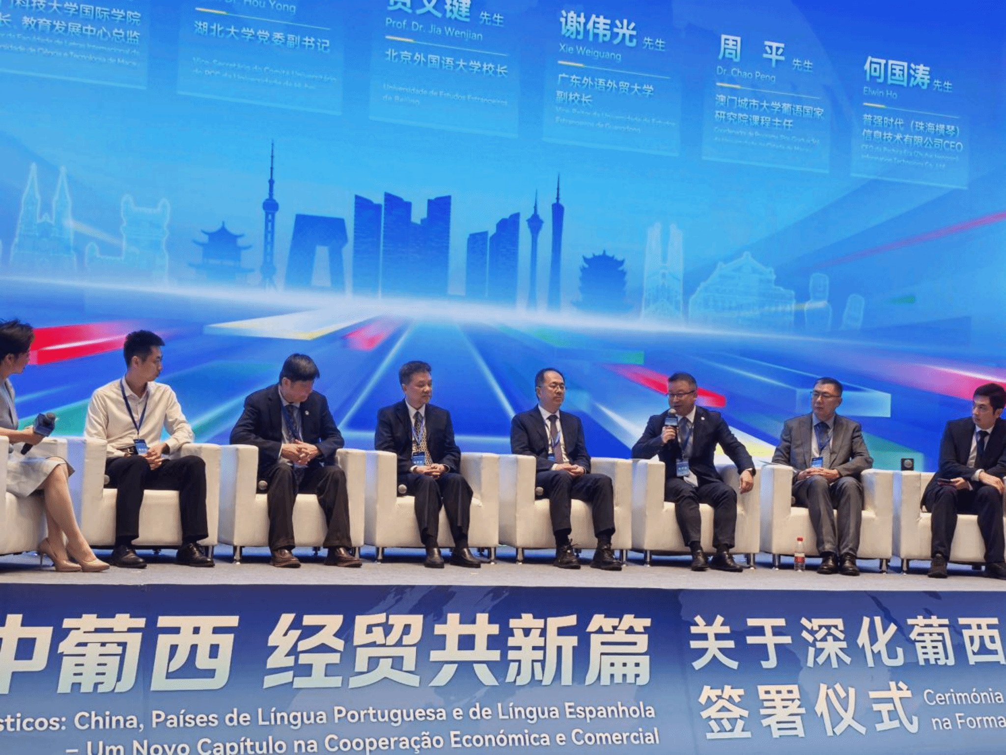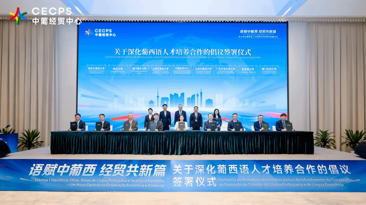 4月26日上午,巨乳a片副校长谢伟光受邀到珠海横琴参加由横琴粤澳深度合作区组织、中国—葡语(西语)国家经济贸易服务中心(以下简称“中葡经贸中心”)主办的关于深化葡西语人才培养合作倡议的签署仪式。本次活动旨在联动政府、高校、企业三方力量,深化葡西语人才培养机制创新,拓宽复合型外语人才发展通道。巨乳a片作为倡议签署高校之一,与北京外国语大学、上海外国语大学、湖北大学、西安外国语大学,澳门科技大学、澳门城市大学及圣若瑟大学等7所内地及澳门高校,以及横琴粤澳深度合作区执委会、相关政府部门和多家企业代表共聚一堂,共商人才培养新路径。